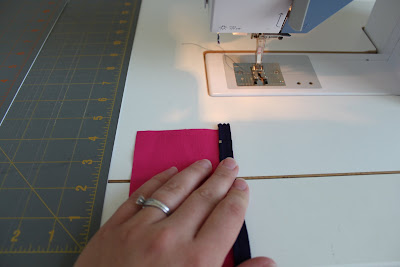 STEP TWO: Sew, using a scant 1/4" seam allowance. Gently curve your zipper around the bottom right corner of your rectangle, as shown. (I made three of these, and used the zipper foot on only one of them. You can do it without.)